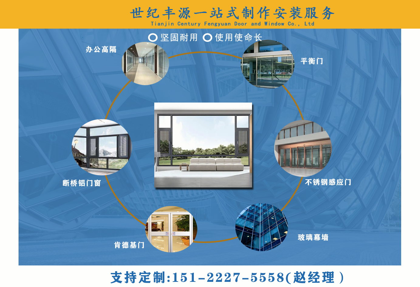 天津世紀(jì)豐源門窗有限公司從事斷橋鋁門窗,玻璃幕墻,平衡門,肯德基門,不銹鋼感應(yīng)門,百葉窗,辦公高隔,制作安裝一站式訂制生產(chǎn)及配套服務(wù)等?! 」咀猿闪⒁詠?,始終堅持以人才為本、誠信立業(yè)的經(jīng)營原則,薈萃業(yè)界精英,成熟的技術(shù)、管理方法及企業(yè)經(jīng)驗與國內(nèi)企業(yè)的具體實際相結(jié)合,為企業(yè)供給各個方面的解決方案,使企業(yè)在激烈的市場競爭中始終堅持競爭力,實現(xiàn)企業(yè)快速、穩(wěn)定地發(fā)展。 質(zhì)量好、服務(wù)好、才能信譽(yù)好,公司已在諸多領(lǐng)域取得輝煌成績,愿意成為您可信賴的長期合作伙伴?! ∽屛覀償y手同行,共同實現(xiàn)“讓普通老百姓都用得上高端門窗”...